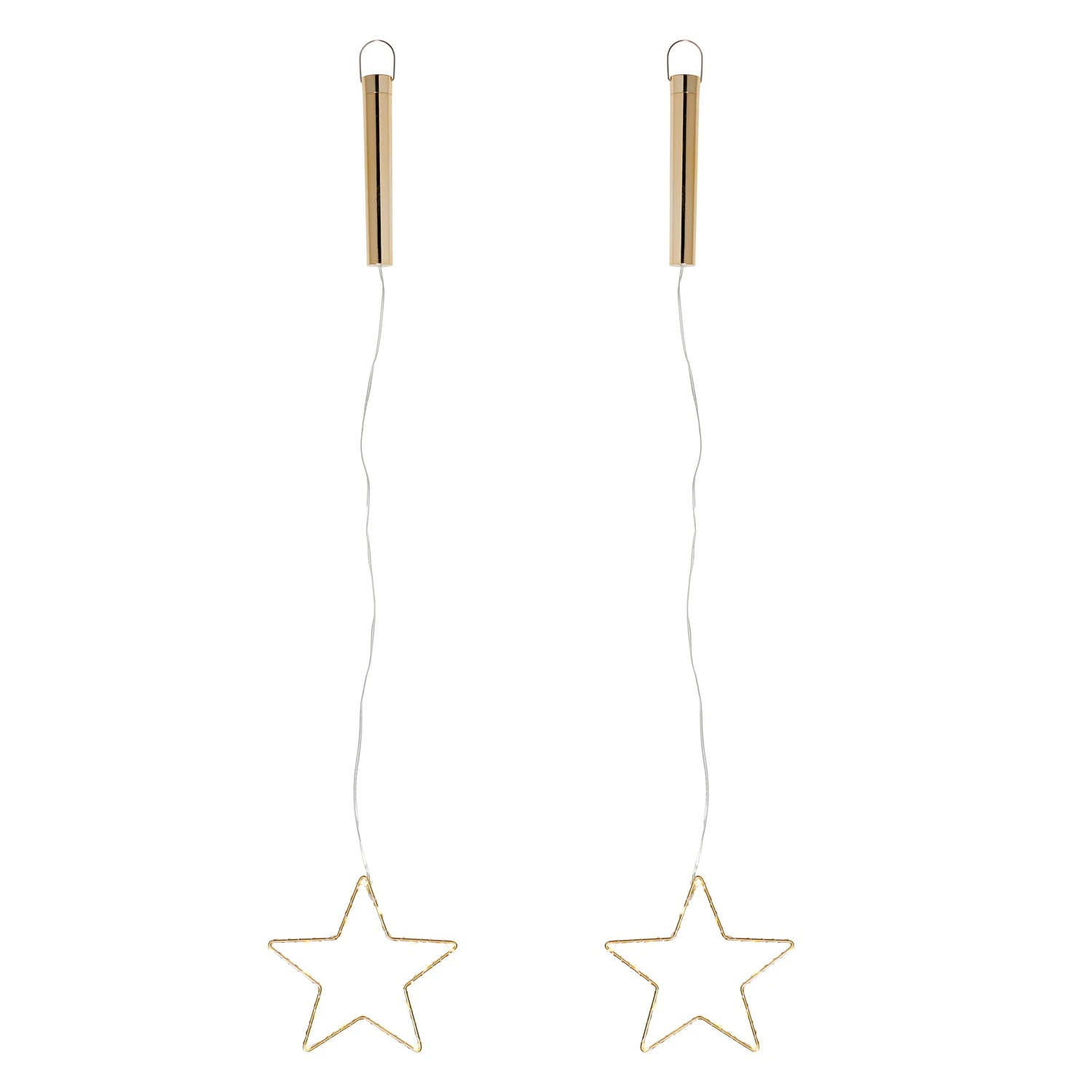 Add a sparkle to your home with our set of 2 mini gold osby stars. Perfect for hanging in windows, positioning on your Christmas tree or simply styling as part of your festive table set-up! Hung from a 50cm lead wire, each star is 15cm in diameter and features 15 warm white LEDs to elegantly bring them to life. With a golden battery tube connected to the end of each lead wire, they are stylish and super easy to hang and power too! Simply pop 2 x AA batteries into each of the battery tubes, and turn on to set the 6 hour timer and watch your lights illuminate automatically at the same time each day. Hang in your window using the hook at the top of the light as the battery pack closes. Add to your star light display by pairing with our other gold star options in the Osby range.
