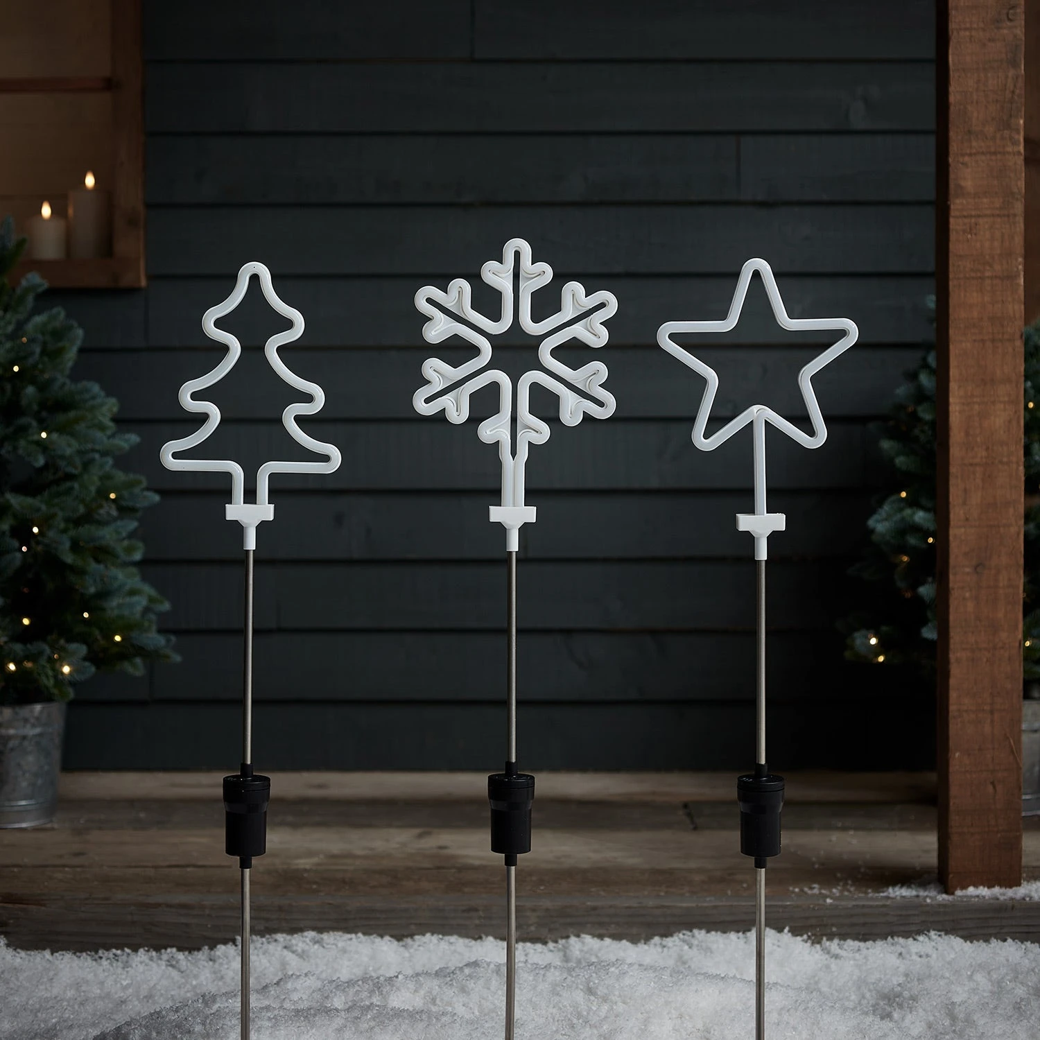 Brighten up the winter evenings with our trio of neon Christmas stake lights. Featuring a green Christmas tree, white snowflake and warm white star stake light, this seasonal set is sure to transform your garden into a playful winter wonderland. All the stake lights have a height of 69cm above ground and have a white frame when switched off during the day. Style them in a row in front of your home or use them as path light for a warm welcome home each evening. The lights are delivered in a flat pack and are super easy to assemble by attaching the 27cm stake and the light together. To illuminate, pop 4 x AA batteries into each light and select the 6 hour timer function for a vibrant glow at the same time each evening.