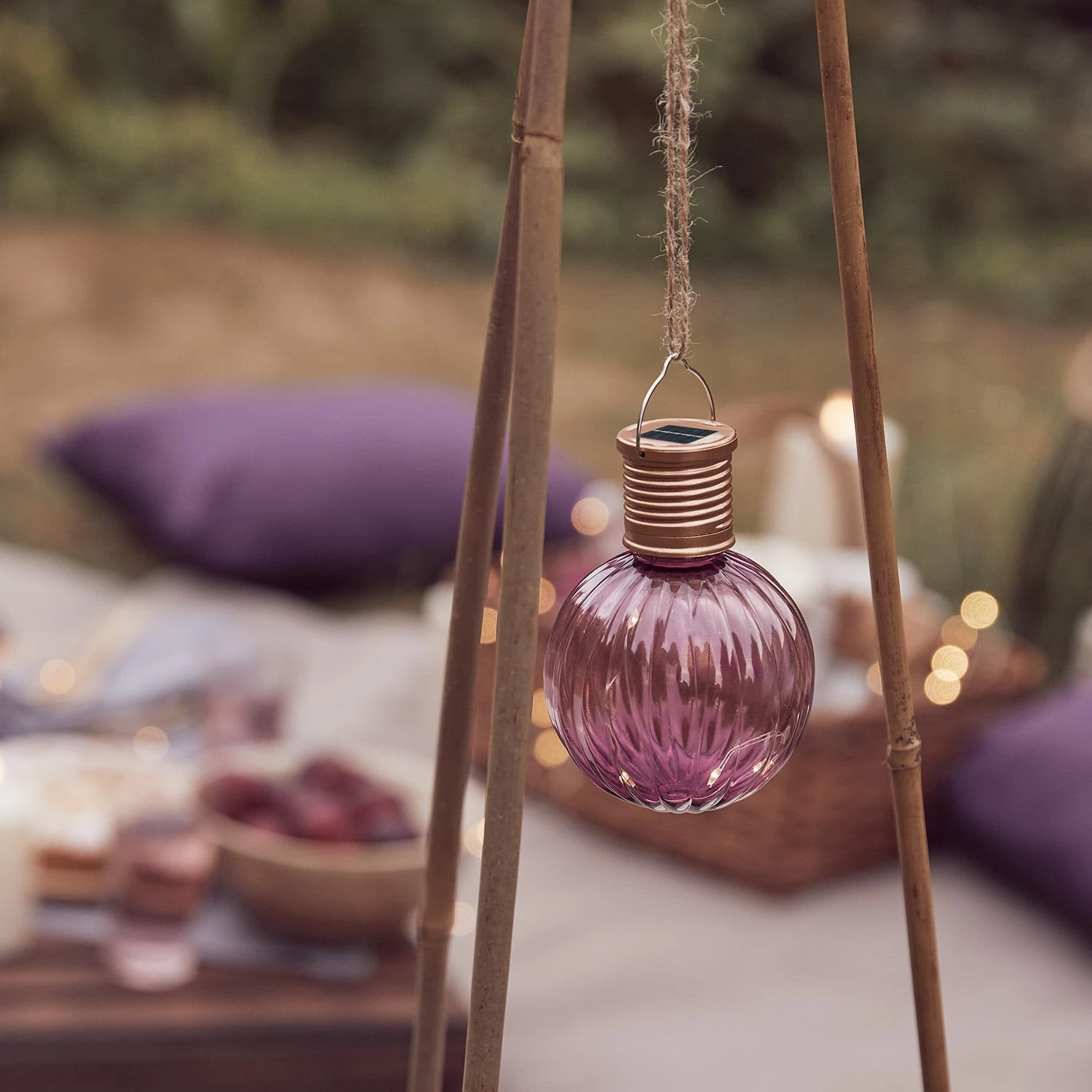Our hanging solar lights add a colourful touch to your outside space for the summer months. Each of the 4 plastic bulbs has a different colour of green, blue, purple and pink, with 4 warm white LEDs contained within each bulb to radiate a soft glow. Measuring a diameter of 8cm and with a hook placed at the top of each bulb, they are easy to attach to a string or wire (not included) of your choice. Hang them from chairs within your alfresco dining area or from hanging baskets to complement your flower display. With a solar panel positioned on the top of each bulb, hang them in a sunny spot in your garden to enable them to charge. You can expect up to 6 hours of illumination each night!