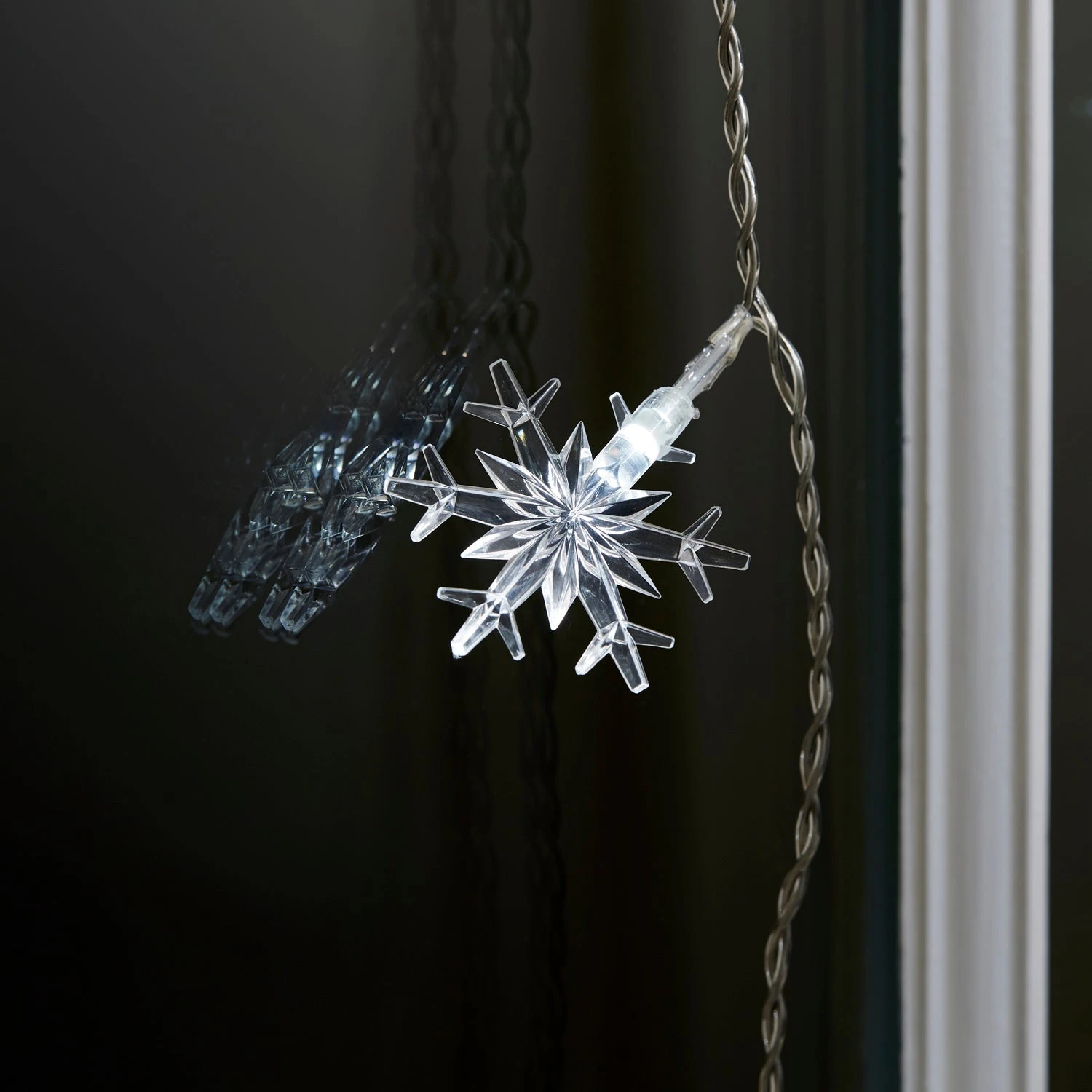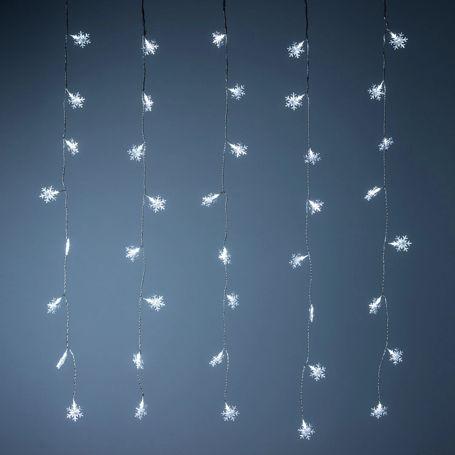 Introduce a frosty Christmas glow to your home with our curtain light. 40 snowflakes caps, each housing an ice white LED, are evenly spread across 5 drops of clear cable for for a glacial finish. This curtain is ready to go straight from the box, simply hang the curtain in windows and use the 5m lead cable to get to the nearest socket. Each string features 8 snowflakes and is 1.2 in length. The snowflake caps measure 5cm in diameter and have a 10cm spacing between each. A handy timer function is included for 6 hours of illumination each day or you can opt for the permanent ‘ON’ setting for uninterrupted shine time.