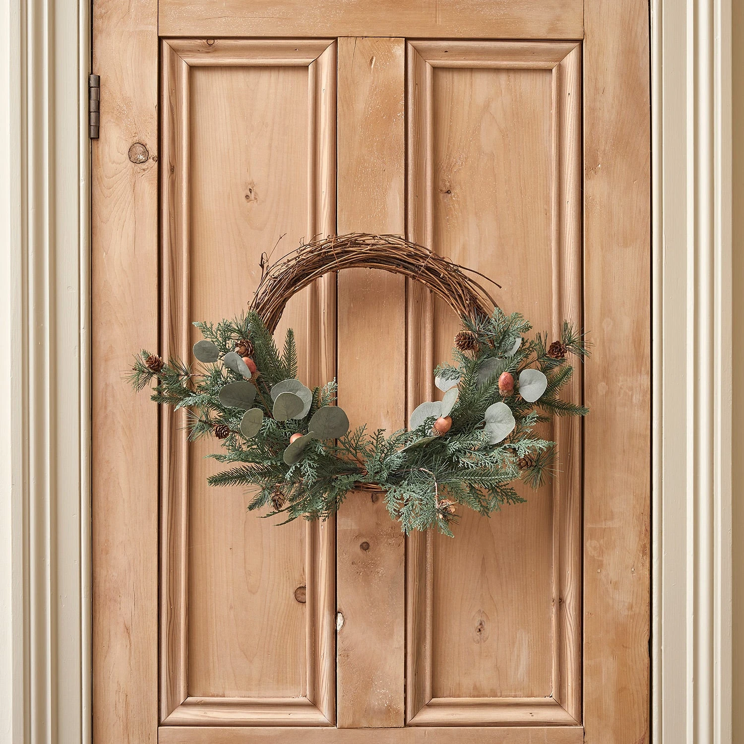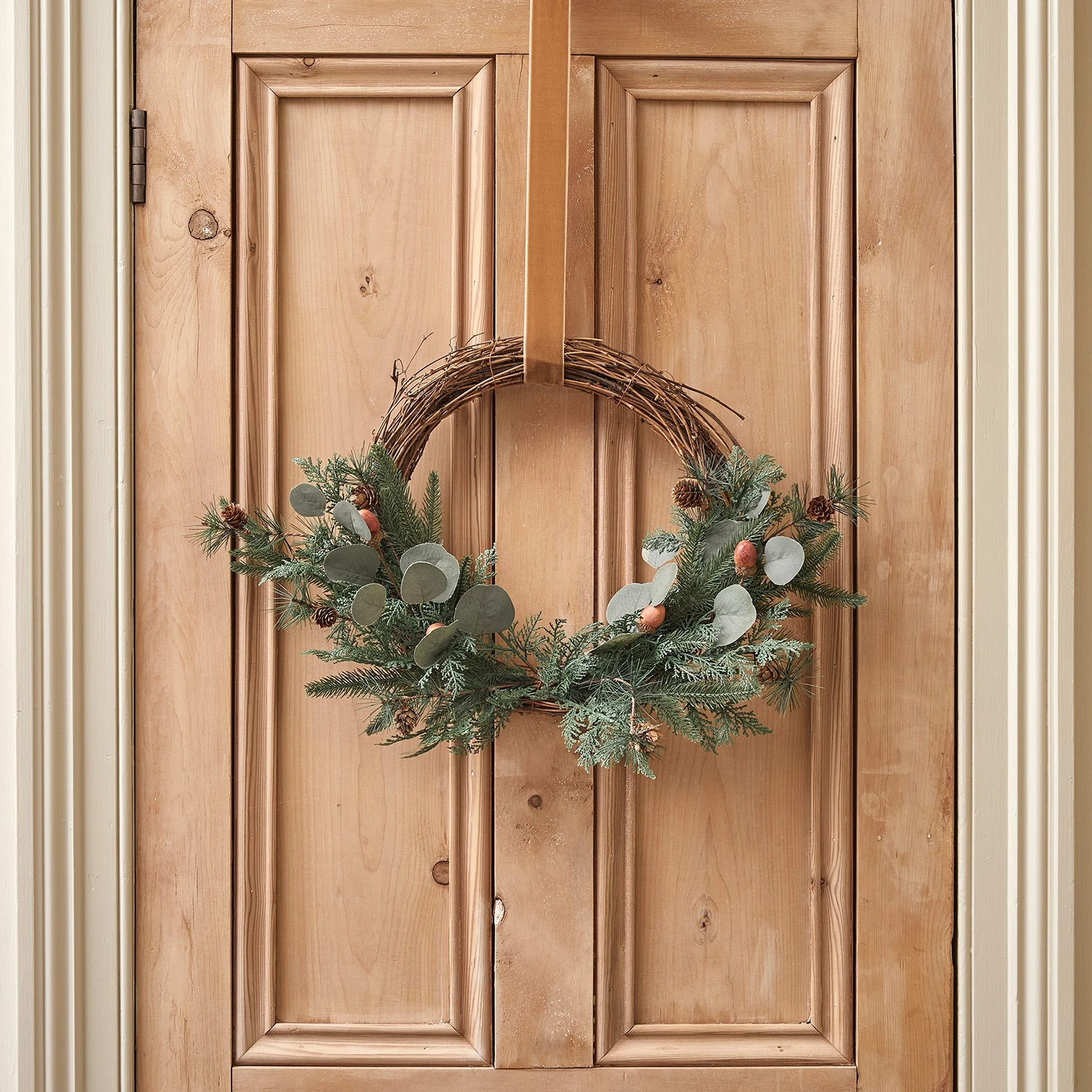 Create a stylish entrance to your home this season with our festive acorn half wreath. Constructed from a strengthened natural frame and crafted from realistic faux foliage with a rustic twist, our half wreath is an on-trend addition to doors or and internal walls. Complete with mini pinecones and acorns on a natural twig frame, our wreath is hung from a gold velvet ribbon to add a festive flair. With an outer diameter of up to 55cm and 1.6m ribbon, it is perfectly designed to look super stylish alone or entwined in micro lights for illumination each evening.