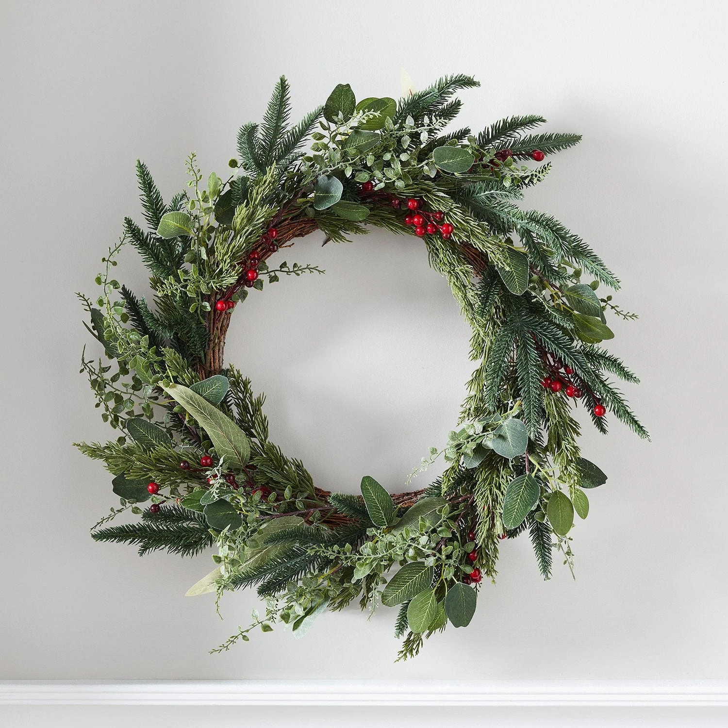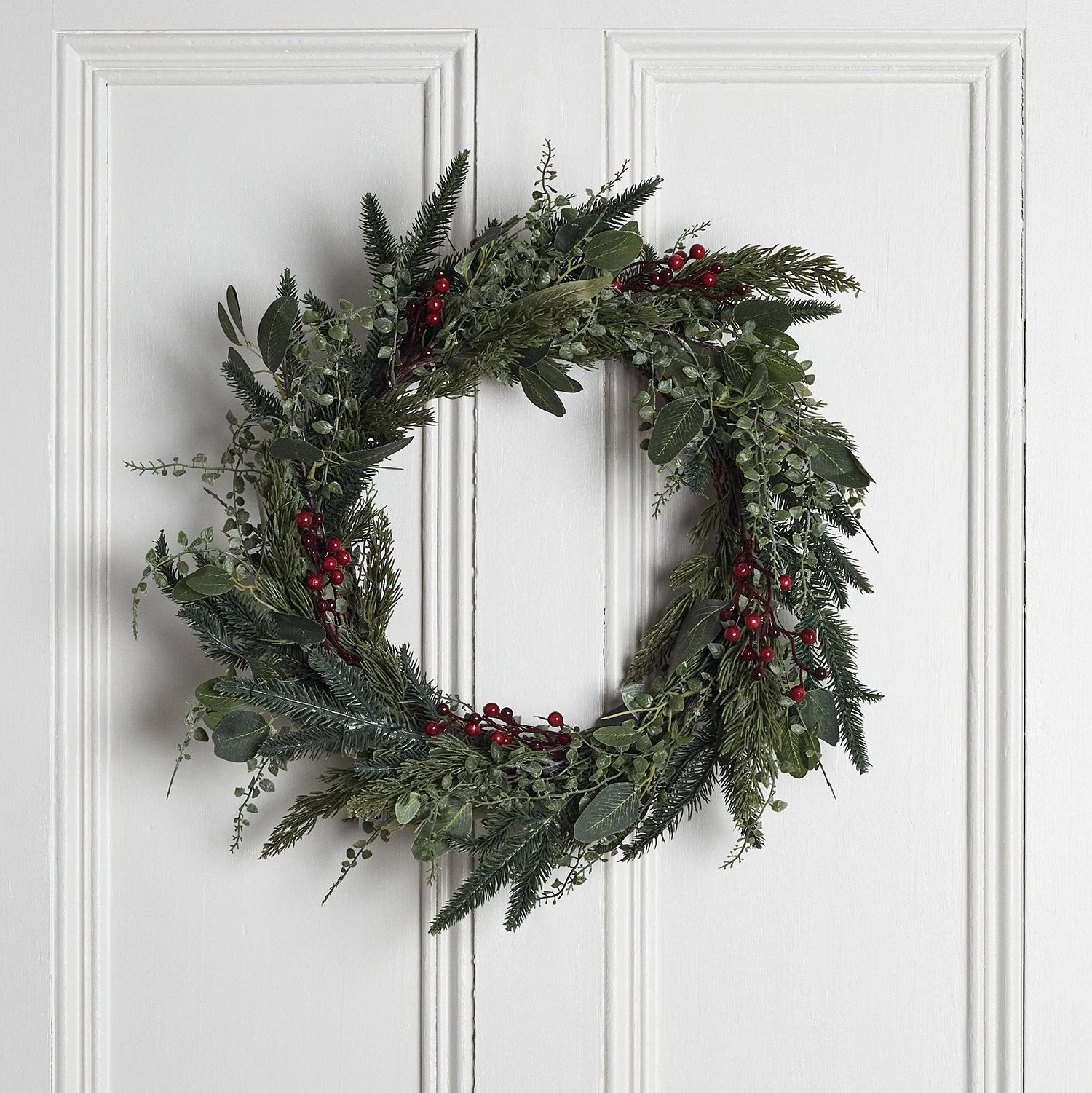 Our realistic wreath incorporates both pine green faux foliage and rich red berry detailing, combining two of our favourite festive colours. This wreath is versatile in its styling and can be featured in your porch, in the hallway or on the mantelpiece. Measuring at a diameter of 56cm, with an inner diameter of 28cm, itβs the perfect focal point for your decor! For a shimmering look, entwine a string of micro LED fairy lights around the wreath and illuminate once night falls.