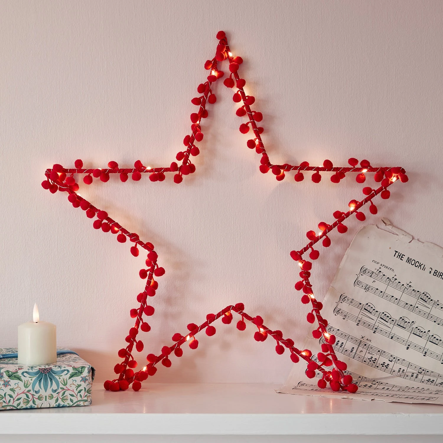 A unique take on the traditional star light, our pom pom Osby star is a playful decoration for your home this Christmas. Perfect for displaying as a stand-out feature on your mantel in your living room or on a shelf in your kitchen, it adds a touch of festive colour wherever it goes! Measuring at a height of 51cm and illuminated by 30 warm white LEDs, itβs complete with red pom pom detailing around the star frame. Simply pop in the batteries and set to the handy timer function for automatic switch on at the same time each day.