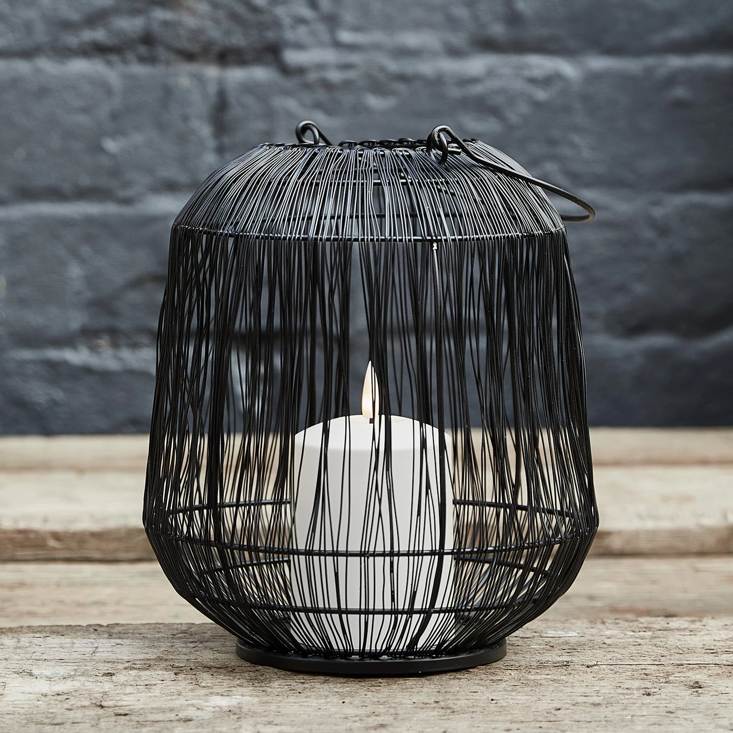 Add a calm and cosy feel to your garden this summer with our large black wire lantern. At 23.5cm in height and with a matte black frame, it’s the perfect contemporary accessory to elevate your patios and outdoor living areas. The lantern houses one of our best selling TruGlow® candles that radiates a comforting warm white flickering glow to fill your space all summer long. within, it’s a real statement piece. Style your lantern by itself on tabletops or around seating areas or pair with our smaller Antonio lantern and candle for an elevated modern finish. Simply pop 2 x C batteries into the base and choose the handy 6 hour timer function for an automatic illumination at the same time each evening. (H) 23.5cm x (W) 20.5cm x (D) 20.5cm