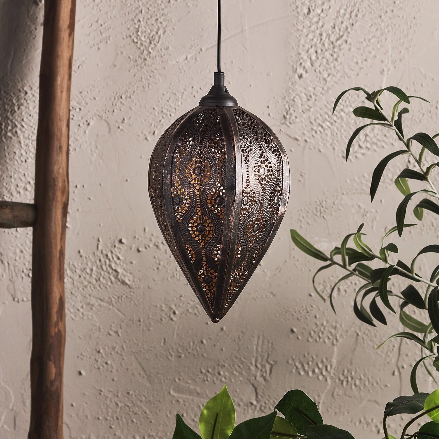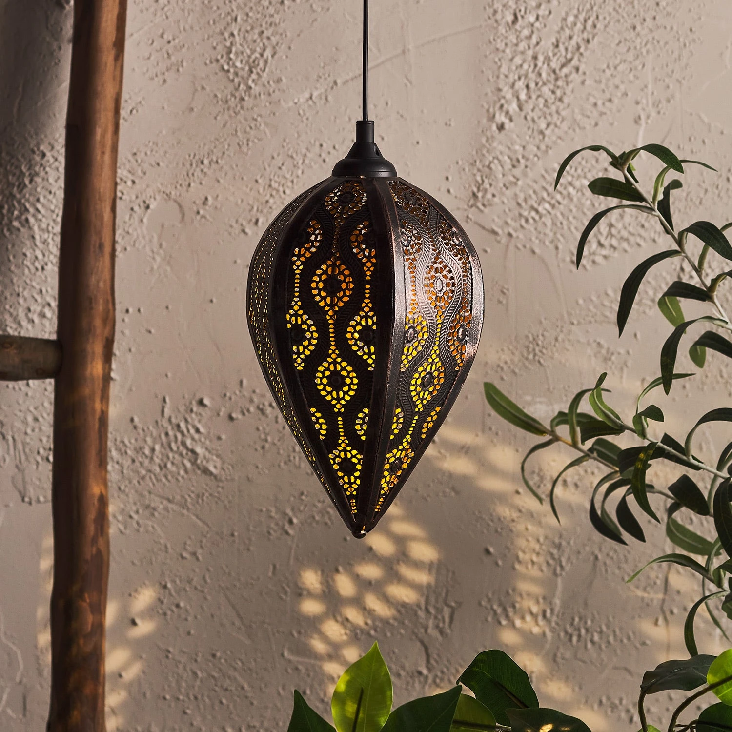 Add a soft summer glow to your garden with our teardrop solar pendant light. Finished in brushed bronze with an interior gold lining, our metal pendant features an intricate cut out design which illuminates an eye-catching and unique pattern around your space. At 23cm tall, it houses a single warm white LED which is completely solar powered. Style by hanging from outdoor structures, roof overhangs or on trees using the hanging hook above the solar panel, ensuring that the solar sensor on top is exposed to sunlight for automatic illumination as dusk falls.