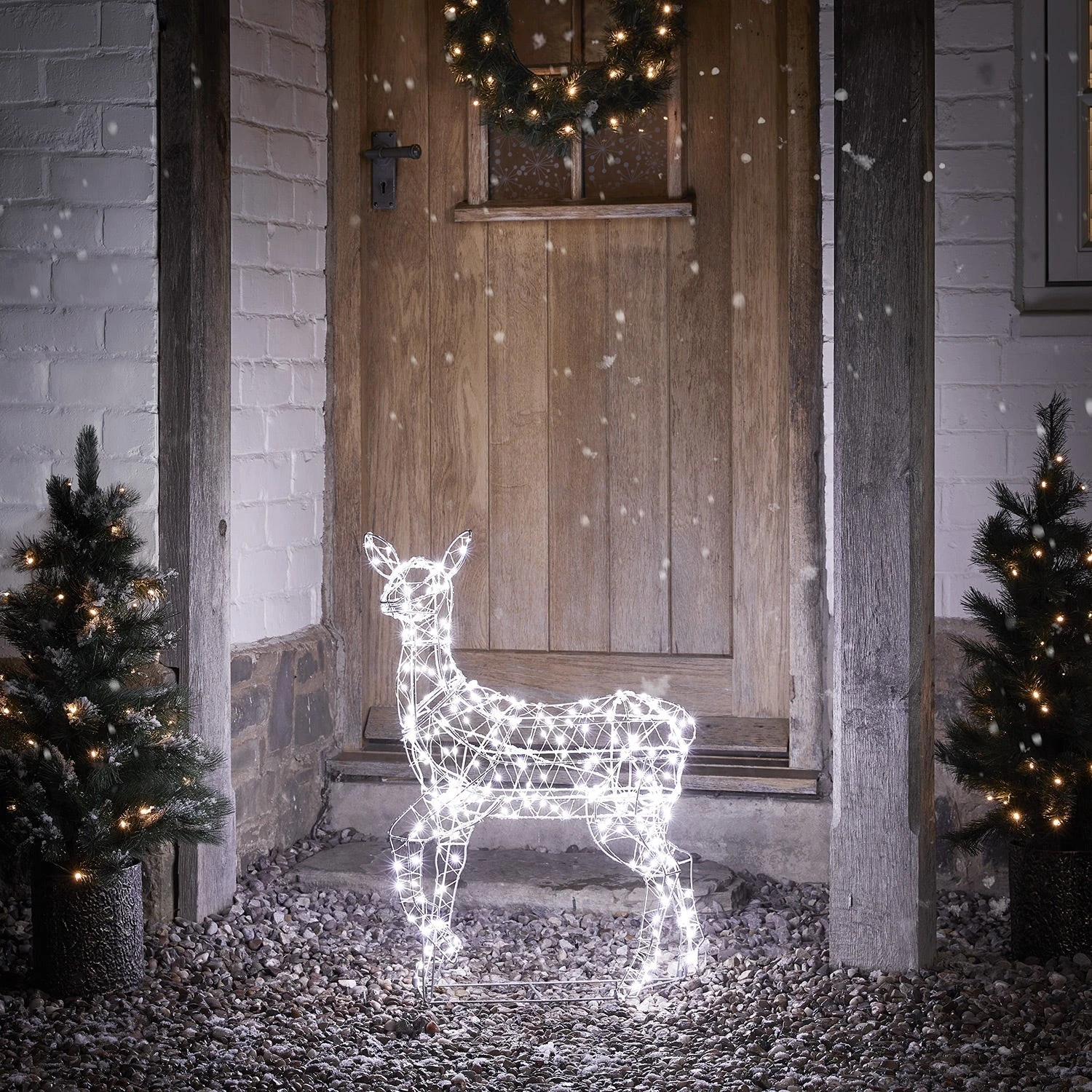 Sure to be a family favourite, our Duchy fawn is the perfect finishing touch to your Christmas display this winter! At 71cm in height and featuring 250 dual coloured micro LEDs, you can match your light up reindeer with the rest of your Christmas decorations with a choice of white, warm white or a mixture of the two for a seamless festive glow. Designed in house by studying real Sika deer at our local Harewood park, this elegant decoration will become a timeless staple in your winter display that will steal the heart of all passers-by. With a weatherproof handmade silver metal frame, you can style your reindeer both indoors and out, and pair it with the matching Duchy stag and doe for a complete Christmas display. To use, simply plug in your fawn using the 8m lead cable, choose your colour LED and opt for the handy 6 hour timer function for an automatic seasonal sparkle at the same time each night.