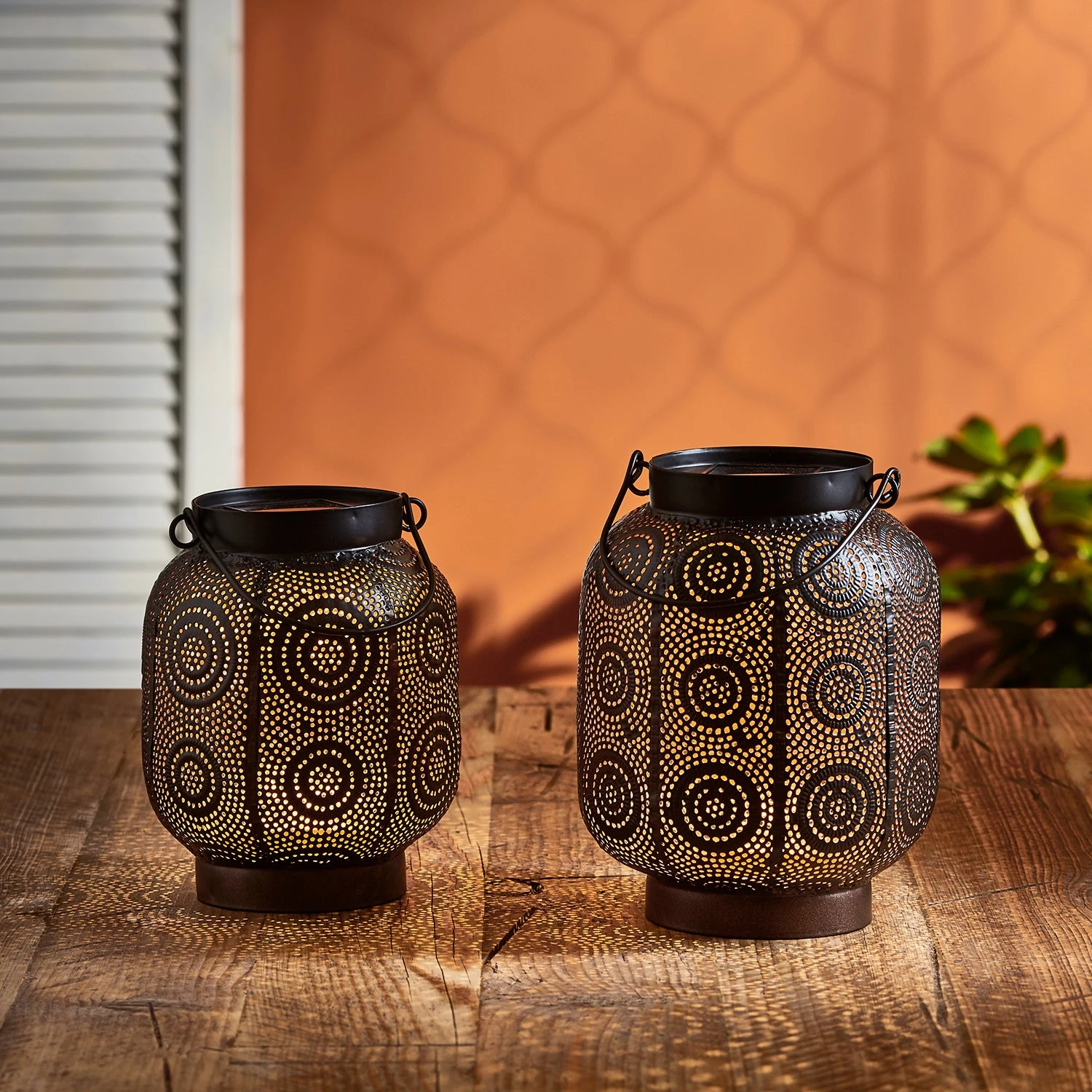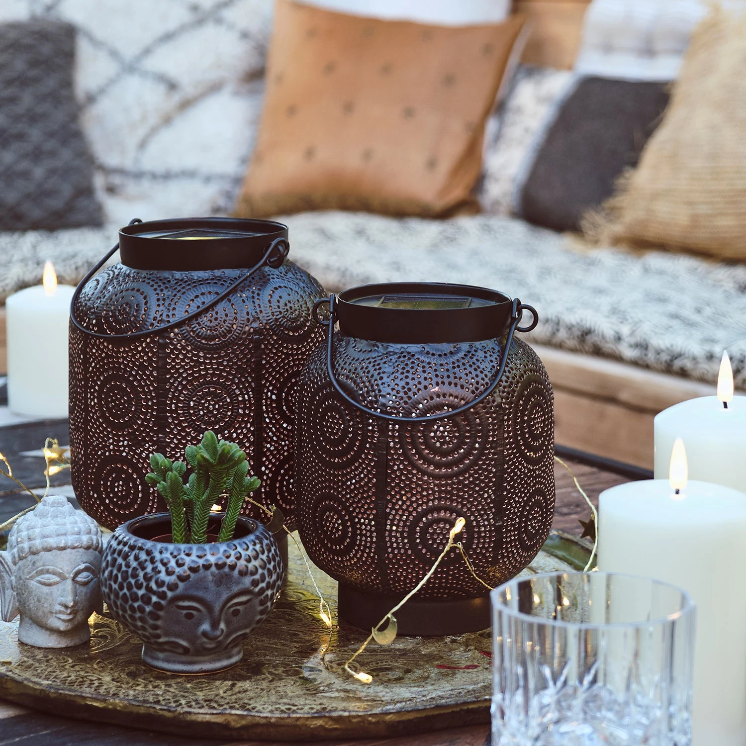 Our Moroccan lantern will add a decorative touch to any outdoor space! With delicate cut out details, once illuminated it produces a warm white glow which reflects patterned shadows onto surrounding surfaces. Simply position in a sunny spot and wait until darkness to fall for automatic illumination. With a full day’s charge you can expect up to 8 hours of illumination come evening.