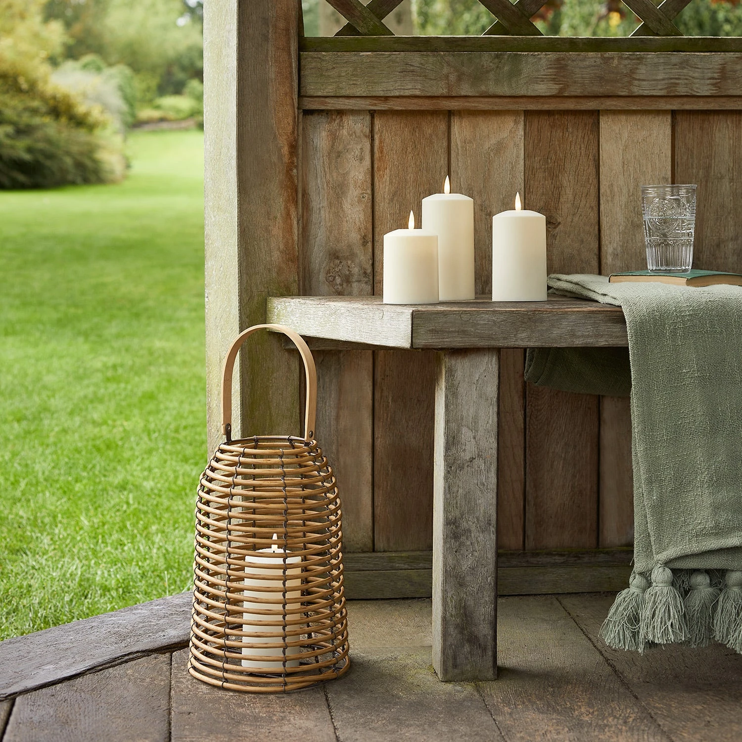 Our rustic rattan garden lantern is the perfect finishing touch to your outdoor space. Measuring at a height of 30cm, the lantern features one of our outdoor TruGlow® candles within the intricate rattan frame. This feature looks great sat on alfresco table tops or patios during spring and summer months. While these lanterns can be used for occasional outdoor use, bring them inside during winter months to keep them looking their best! Simply pop the batteries into the base of the candle and set to the 6 hour timer for automatic illumination every evening. You can expect up to 1200 hours of illumination time before the batteries will need refreshing.
