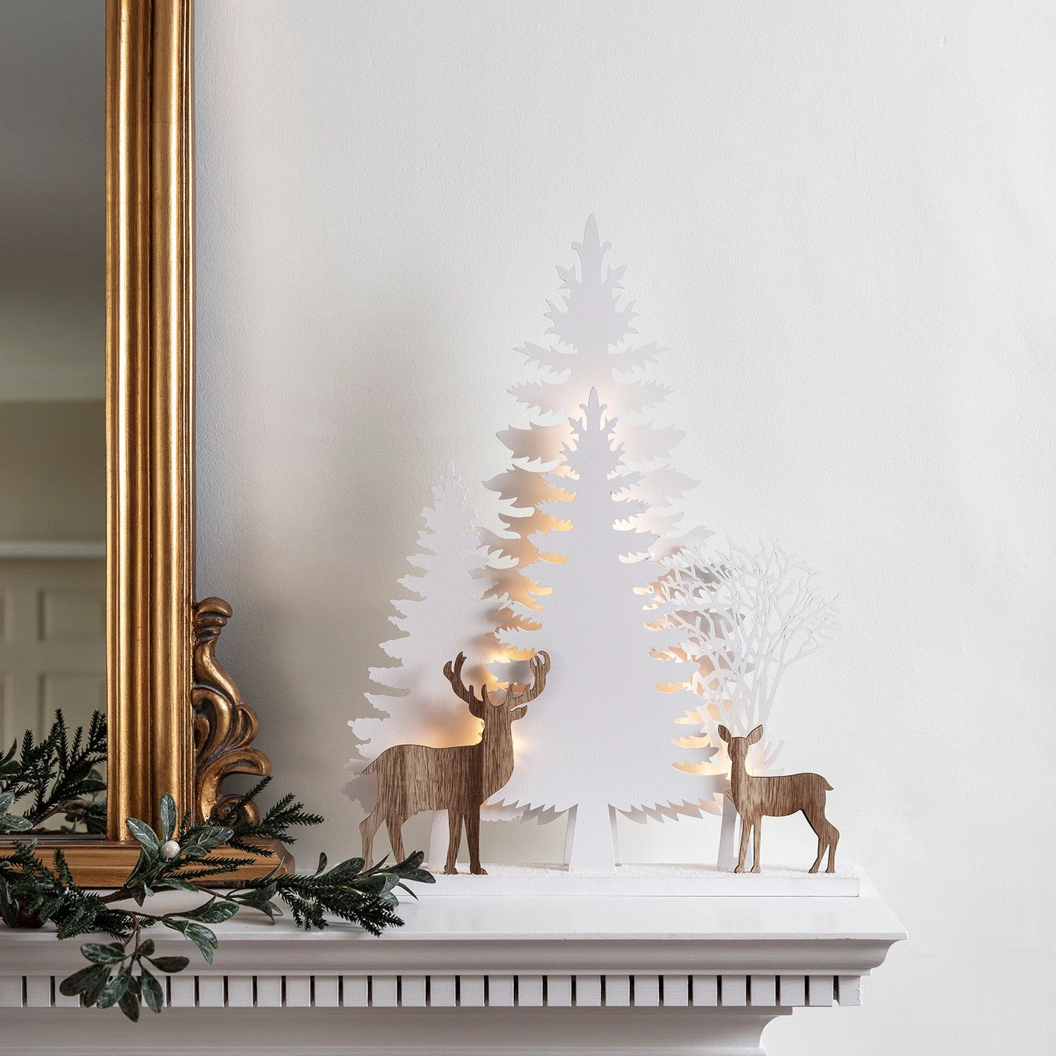 Our charming silhouette is a magical Christmas decoration that’ll bring warmth into your home this winter. The layered cut out trees are backlit by 15 warm white LEDs for a golden glow. Pop on windowsills or mantelpieces for an unmissable festive display.