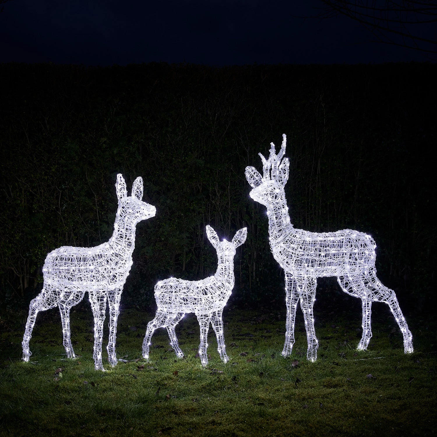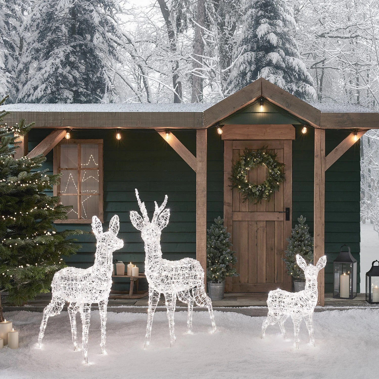 Welcome the magic of Christmas into your garden this winter with our Swinsty reindeer family. With 540 bright colour LEDs between them, you have the option of lighting up your reindeer in white, warm white, or a mixture of the two, to create a seamless seasonal display with the rest of your outdoor Christmas lights. At 1.25m, 1.05m and 77cm tall, these magnificent figures were designed studying wild Roe deer and are hand wrapped in clear acrylic to reflect the sparkling glow of the LEDs. Each reindeer comes with an 8m lead cable, so you can style them anywhere in your garden for a showstopping winter display. To use, simply plug in your reindeer, choose your colour LED, and opt for the handy 6 hour timer function to bring your display to life at the same time each night…as if by magic.